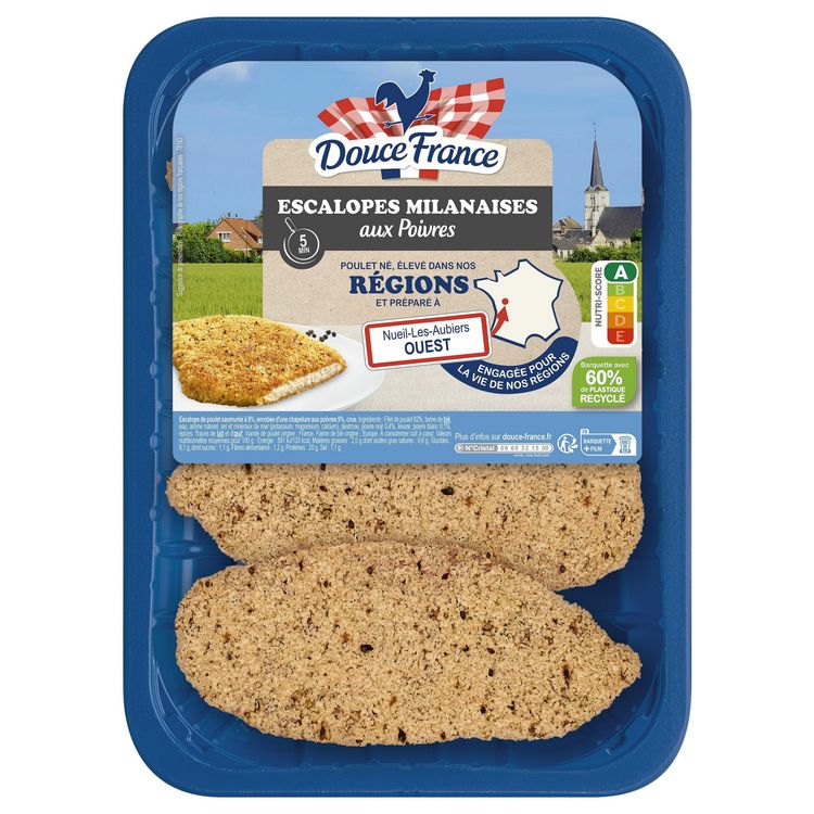 Escalope de poulet saumuré, enrobée d'une chapelure aux poivres, crue.