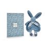 Ce doudou lapin bleu au minois attendrissant est d'une forme généreuse et allongée, ce qui le rend agréable à câliner. Son poil soyeux et doux au toucher est un véritable atout pour le bien-être de bébé. Son ravissant foulard et ses nouettes délicatement cousues ajoutent une dimension tactile et lud