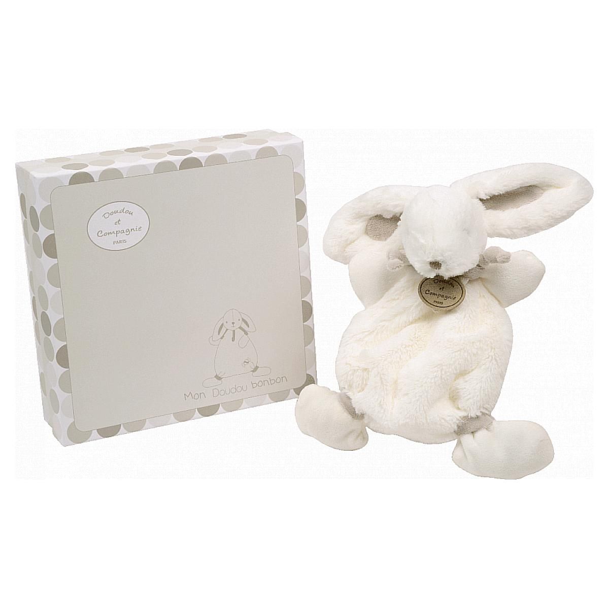 Ce lapin blanc tout doux avec son noeud de couleur bleu,rose ou taupe sera rapidement la peluche préférée de votre bout de chou. Dimensions : 26cm