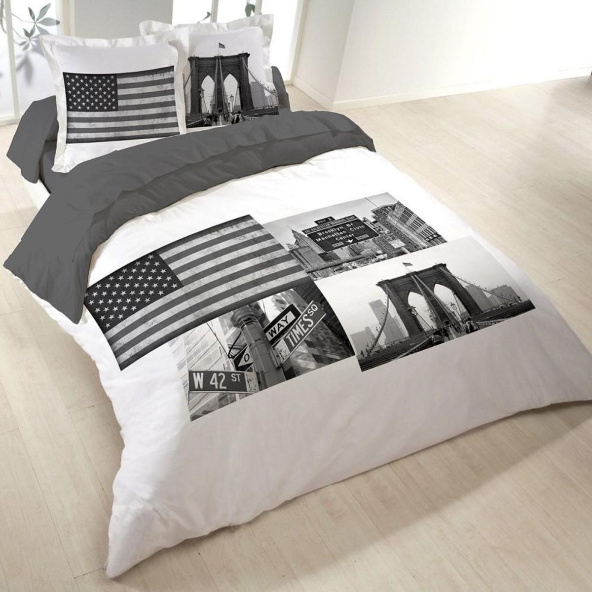 Habillez votre lit à votre image grâce à cette superbe et douce housse de couette Time Square pour lit 2 personnes fabriquée en 100% coton au tissage serré 52 fils/cm².Cette housse de couette 3 pièces Time Square est composée de :Une housse de couette 240x220 cmDeux taies d'oreiller 65x65 cmCette ho