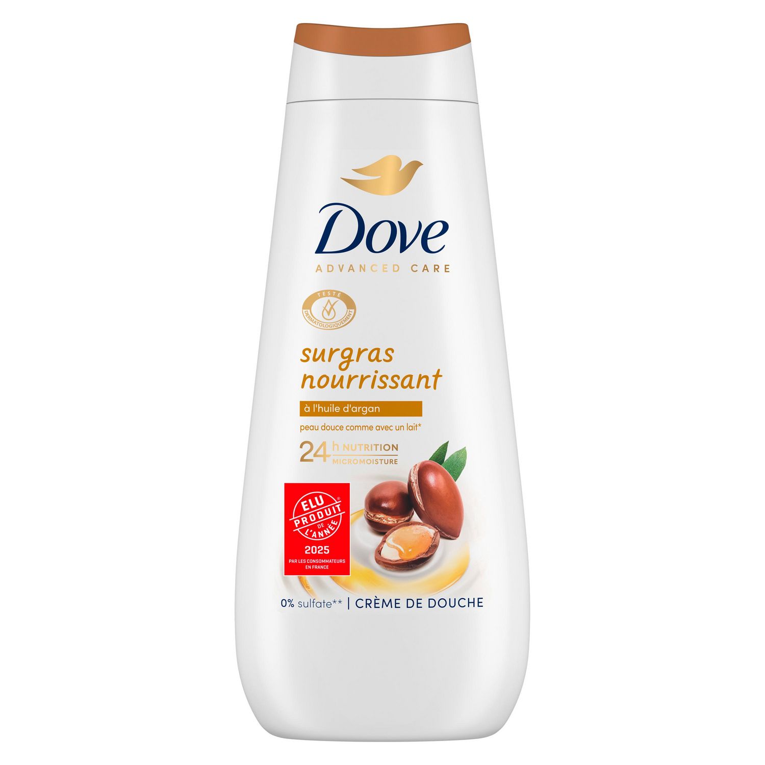 La crème de douche Dove Advanced Care Surgras nourrissant, à l'huile d'Argan, nourrit et prend soin des peaux sèches, et procure une sensation de peau douce comme avec un lait corporel pendant 24 h.