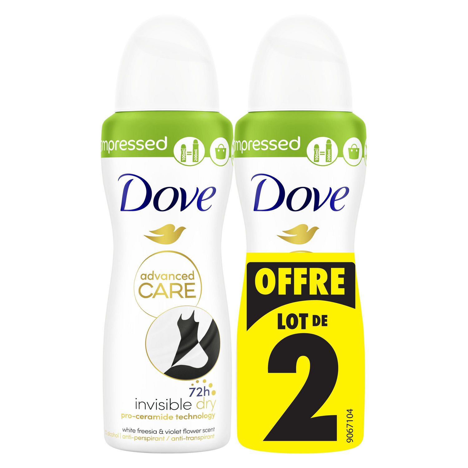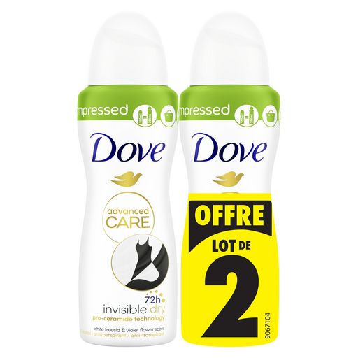 Le déodorant spray compressé anti-transpirant Dove Advanced Care Invisible Dry prend soin de vos aisselles et de vos vêtements au quotidien.