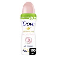 Prenez soin de vos aisselles avec le déodorant spray anti-transpirant Dove Advanced Care Beauty Finish. Le déodorant anti-transpirant Dove Advanced Care est doux pour les aisselles, même après le rasage. À la technologie hydratante triple action, Dove Advanced Care prend soin de vos aisselles au quotidien et les laisse douces et lisses. Grâce à sa technologie anti-transpirante brevetée, il aide à combattre efficacement la transpiration et vous procure 72 h de protection anti-transpirante. De plus, votre déodorant Dove compressé de 100 ml dure aussi longtemps que votre déodorant Dove au format classique de 200 ml. Sans alcool et formulés avec le meilleur du soin Dove, les déodorants anti-transpirants Dove Advanced Care protègent la peau délicate des aisselles. Vous pouvez être confiante toute la journée ! Dove Advanced Care Beauty Finish 100 ml est fabriqué dans une usine utilisant 100 % d'électricité renouvelable et son flacon est conçu en aluminium, matériau recyclable à l'infini. Dove offre aux femmes de véritables rituels de beauté pour qu'elles prennent soin d'elles au quotidien. En mettant son expertise technologique au service de la beauté, la marque propose des soins hautement performants pour le corps. Ses maîtres-mots qualité, simplicité et efficacité se retrouvent dans chacun de ses produits uniques. À travers son Projet pour l'Estime de Soi, Dove œuvre depuis plus de 15 ans pour renforcer la confiance corporelle des jeunes filles à travers le monde. Parce que la beauté n'a ni formes, ni tailles, ni couleurs, la marque s'engage à réaliser ses supports de communication avec de vraies femmes et non des mannequins professionnels. Dove écrit sa version de la beauté à vos côtés : positive, authentique et réelle.