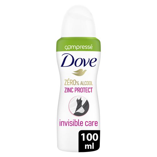 Le déodorant spray compressé Dove Invisible Care prend soin de votre peau et de vos vêtements. Son format compressé de 100 ml dure aussi longtemps et vous offre autant d'utilisations qu'un déodorant Dove au format classique de 200 ml. Le déodorant spray Dove 0% alcool vous apporte notre protection déodorante la plus efficace avec 72 h anti-odeurs, tout en restant doux pour votre peau. Sa technologie au zinc, un minéral naturellement antibactérien, offre une double action anti-odeurs. D'une part, il combat efficacement les bactéries à l'origine des mauvaises odeurs, d'autre part, il piège et neutralise les mauvaises odeurs pour plus de fraîcheur. Avec son unique ¼ de crème hydratante, Dove prend soin de votre peau. De plus, son flacon et son bouchon sont majoritairement recyclables. Dove offre aux femmes de véritables rituels beauté pour qu'elles prennent soin d'elles au quotidien. En mettant son expertise technologique au service de la beauté, la marque propose des soins hautement performants pour le corps. Ses maîtres-mots qualité, simplicité et efficacité se retrouvent dans chacun de ses produits uniques. À travers son Projet pour l'Estime de Soi, Dove œuvre depuis plus de 15 ans pour renforcer la confiance corporelle des jeunes filles à travers le monde. D'ici à 2030, nous aurons aidé 250 millions de jeunes à renforcer leur estime de soi. Parce que la beauté n'a ni formes, ni tailles, ni couleurs, la marque s'engage à réaliser ses supports de communication avec de vraies femmes et non des mannequins professionnels. Dove écrit sa version de la beauté à vos côtés : positive, authentique et réelle.