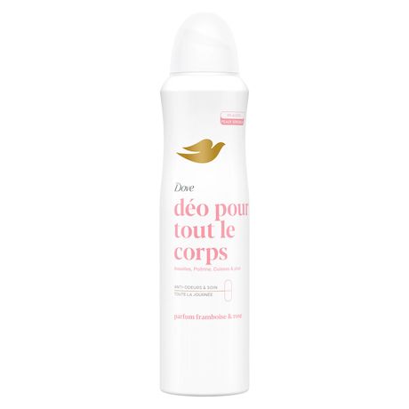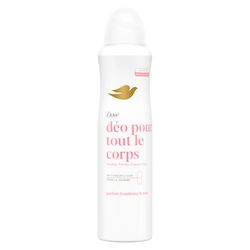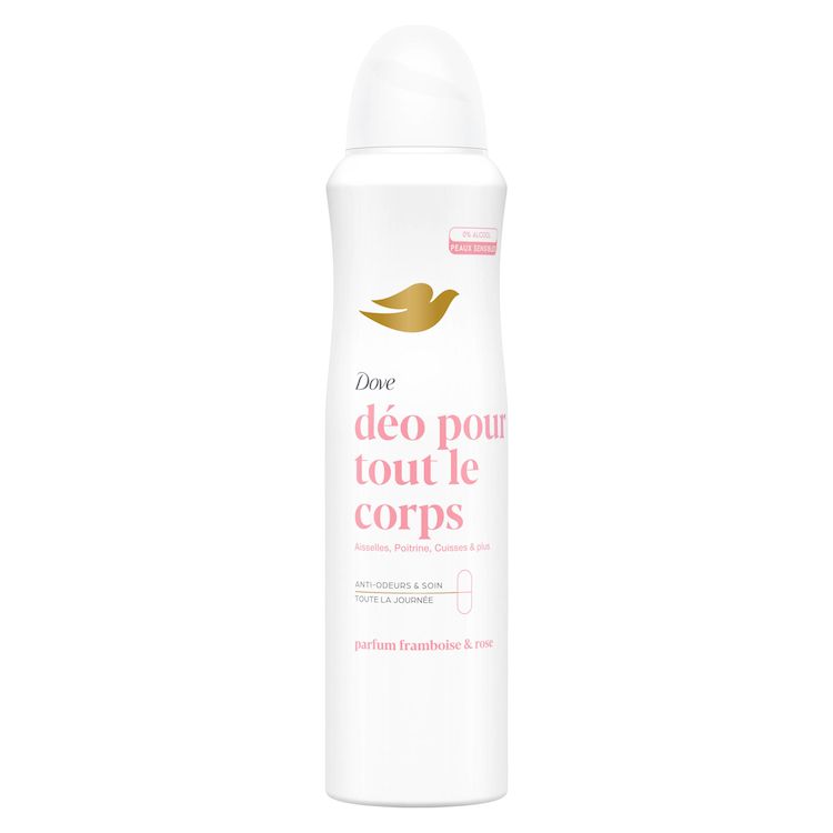 Les mauvaises odeurs ne se limitent pas aux aisselles, nous transpirons sur tout le corps. Vous en avez assez des odeurs corporelles qui se mettent en travers de votre chemin ? Découvrez le déodorant pour tout le corps spray 72h Framboise & Rose Dove, issu de notre gamme de déodorants pour tout le corps. Il combine une protection contre les odeurs toute la journée avec le soin Dove. Des déodorants 0% alcool conçus pour les peaux sensibles. Des vagues de chaleur au hot yoga* ? Notre déodorant pour tout le corps vous protège contre les mauvaises odeurs - des aisselles, à la poitrine, aux cuisses et plus ! Testée sous contrôle dermatologique, la formule de notre déodorant pour tout le corps associe des actifs anti-odeurs à des ingrédients de soin pour la peau. Nos déodorants pour tout le corps Dove sont anti-traces blanches et existent en trois formats : spray, stick ou crème, faites votre choix ! Ils se déclinent également en deux versions parfumées : laissez-vous tenter par le parfum délicat et floral Lavande & Camomille ou par celui fruité et fleuri Framboise & Rose ! Ce déodorant corps spray permet d'atteindre facilement les zones difficiles d'accès comme le dos ou les pieds grâce à son utilisation tête en bas. Ne pas vaporiser vers les yeux et ne pas utiliser sur les parties intimes. Pour usage externe uniquement. À l'échelle mondiale, Dove ne procède à aucun test sur les animaux et est certifié Cruelty Free (sans cruauté) par PETA. Pour en savoir plus : dove.com/fr. *Yoga chaud.