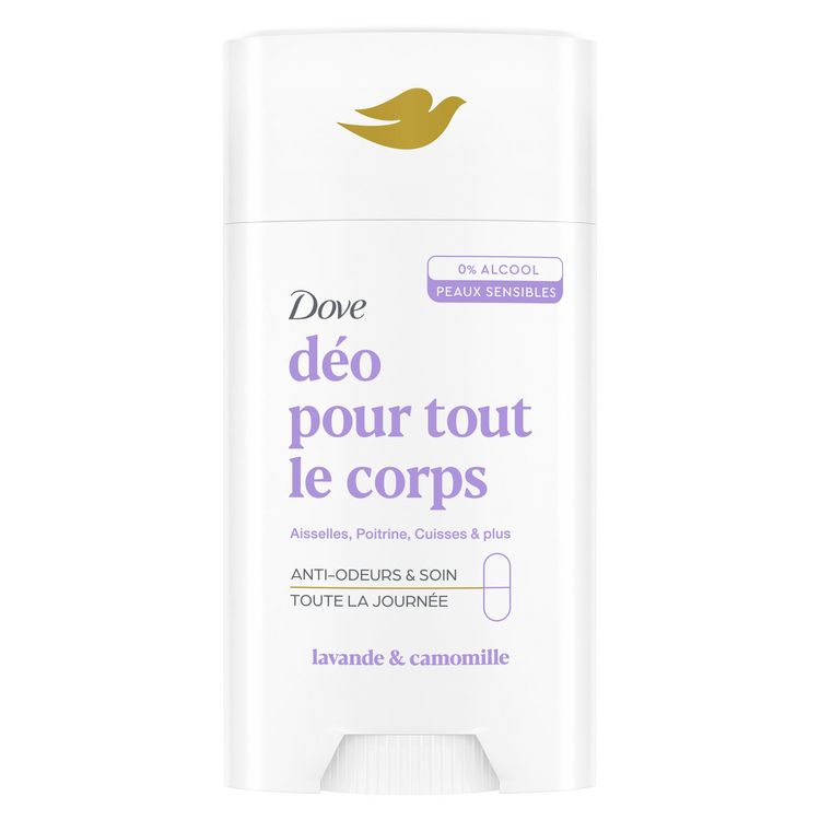 Les mauvaises odeurs ne se limitent pas aux aisselles, nous transpirons sur tout le corps. Vous en avez assez des odeurs corporelles qui se mettent en travers de votre chemin ? Découvrez le déodorant pour tout le corps stick 24h Lavande & Camomille Dove, issu de notre gamme de déodorants pour tout le corps. Il combine une protection contre les odeurs toute la journée avec le soin Dove. Des déodorants 0% alcool conçus pour les peaux sensibles. Ce déodorant stick peut être utilisé sur toutes les parties du corps, particulièrement sur les cuisses, les plis de la peau et plus, pour une application précise. Testé gynécologiquement, ce stick peut être utilisé sur les parties intimes. Pour usage externe uniquement. Des vagues de chaleur au hot yoga* ? Notre déodorant pour tout le corps vous protège contre les mauvaises odeurs - des aisselles, à la poitrine, aux cuisses et plus ! Testée sous contrôle dermatologique, la formule de notre déodorant pour tout le corps associe des actifs anti-odeurs à des ingrédients de soin pour la peau. Nos déodorants pour tout le corps Dove sont anti-traces blanches et existent en trois formats : spray, stick ou crème, faites votre choix ! Ils se déclinent également en deux versions parfumées : laissez-vous tenter par le parfum délicat et floral Lavande & Camomille ou par celui fruité et fleuri Framboise & Rose ! À l'échelle mondiale, Dove ne procède à aucun test sur les animaux et est certifié Cruelty Free (sans cruauté) par PETA. Pour en savoir plus : dove.com/fr. *Yoga chaud.