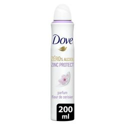 Le déodorant spray compressé Dove Fleur de Cerisier prend soin de votre peau. Le déodorant spray Dove 0% alcool vous apporte notre protection déodorante la plus efficace avec 72 h anti-odeurs, tout en restant doux pour votre peau. Sa technologie au zinc, un minéral naturellement antibactérien, offre une double action anti-odeurs. D'une part, il combat efficacement les bactéries à l'origine des mauvaises odeurs, d'autre part, il piège et neutralise les mauvaises odeurs pour plus de fraîcheur. Avec son unique ¼ de crème hydratante, Dove prend soin de votre peau. De plus, son flacon et son bouchon sont majoritairement recyclables. Dove offre aux femmes de véritables rituels beauté pour qu'elles prennent soin d'elles au quotidien. En mettant son expertise technologique au service de la beauté, la marque propose des soins hautement performants pour le corps. Ses maîtres-mots qualité, simplicité et efficacité se retrouvent dans chacun de ses produits uniques. À travers son Projet pour l'Estime de Soi, Dove œuvre depuis plus de 15 ans pour renforcer la confiance corporelle des jeunes filles à travers le monde. D'ici à 2030, nous aurons aidé 250 millions de jeunes à renforcer leur estime de soi. Parce que la beauté n'a ni formes, ni tailles, ni couleurs, la marque s'engage à réaliser ses supports de communication avec de vraies femmes et non des mannequins professionnels. Dove écrit sa version de la beauté à vos côtés : positive, authentique et réelle.