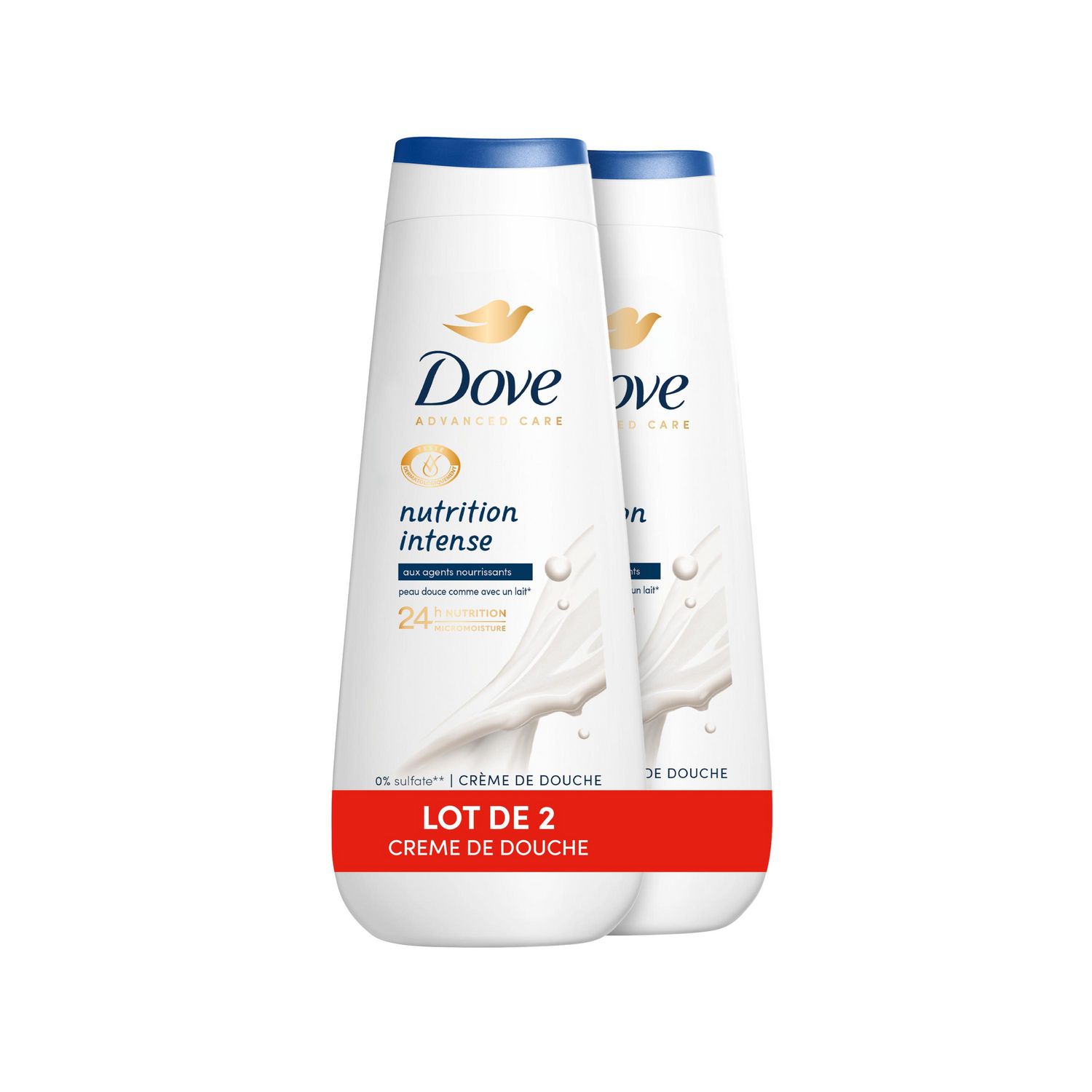 La crème de douche Dove Advanced Care Nutrition Intense restaure l'hydratation naturelle de la peau et procure une sensation de peau douce comme avec un lait corporel pendant 24 h.