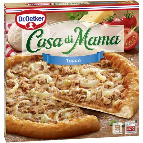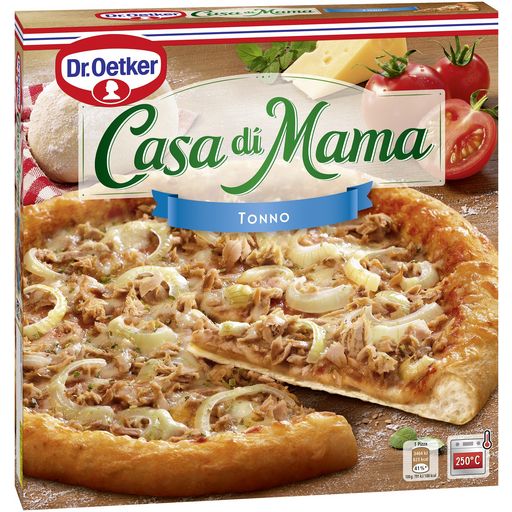 Une pizza aux bords qui lèvent au four, croustillants à l'extérieur et moelleux à l'intérieur, généreusement garnie de miettes de thon relevées de fines tranches d'oignons et parsemé de fromages tendres et fondants, Mozzarella et Edam. • Pizza à la pâte fine fraîche dont les bords lèvent au four, ce qui les rend croustillants à l’extérieur et moelleux à l’intérieur ; • Généreusement garnie de miettes de thon, fines tranches d’oignons, Mozzarella et Edam ; • Conservation de 9 mois et qualités gustatives préservées grâce à la surgélation ; • Rapide et facile à préparer : cuisson de 12 à 14 minutes au four, c’est prêt, dégustez ! Casa di Mama Tonno : toute la saveur des tomates et du fromage associée à la fraicheur du thon Une pizza aux bords qui lèvent au four, croustillants à l'extérieur et moelleux à l'intérieur, généreusement garnie de miettes de thon relevées de fines tranches d'oignons et parsemé de fromages tendres et fondants, Mozzarella et Edam. La Casa di Mama Tonno ravira les papilles de tous les adeptes de pizzas au poisson. Rapide et facile à préparer ! Vous devez disposer d’un four pour cuire votre pizza : four traditionnel, four à chaleur tournante ou four à gaz. Préchauffez votre four à 250°C (four traditionnel), 230°C (four chaleur tournante), Th. 6 (four à gaz). Sortez la pizza de son emballage. Enlever le film plastique et le support en carton. Laisser le papier de cuisson sous la pizza. Placer la pizza surgelée sur la plaque de cuisson dans la partie inférieure du four. Faites cuire 12 à 14 minutes (le temps de cuisson peut varier en fonction de votre four). Les pizzas Casa di Mama Casa Di Mama est une pizza individuelle gourmande, à la pâte fine et fraîche dont les bords lèvent au four, ce qui les rends croustillants à l'extérieur et moelleux à l'intérieur. Sa garniture généreuse et pleine de saveur, aux ingrédients sélectionnés, fait de Casa di Mama une pizza comme à la maison, faite par une mama italienne. Une pizza individuelle, partagée avec son partenaire pour un diner romantique à l'italienne. A partager également avec sa famille ou ses amis pour un moment de partage, convivial et chaleureux. Pizza qui lève au four, richement garnie d'une délicieuse sauce tomate, de thon et d'oignons. Surgelée.