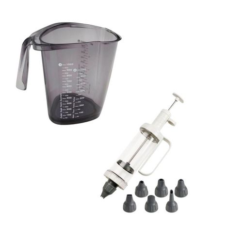 - DESCRIPTION : Ce kit de pâtisserie comprend un verre à mesurer de 1 litre et une seringue pâtissière avec 6 embouts à motif, idéal pour la préparation et la décoration de gâteaux et autres pâtisseries