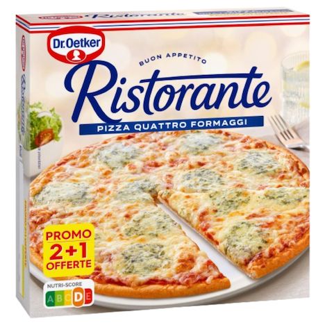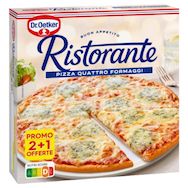 Savourez la pizza Ristorante Quattro Formaggi. Une pâte toujours fine et croustillante, légèrement irrégulière généreusement garnie de 4 fromages différents : de l’Edam doux, de l’Emmental, du Bleu et de la Mozzarella. Un assortiment raffiné et irrésistible, disposé sur une couche de sauce tomate cuisinée. 2 pizzas + 1 offerte ! Nutriscore C.