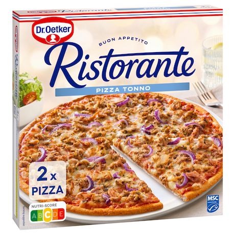 Savourez les pizzas Ristorante Tonno. Une pâte toujours fine et croustillante, légèrement irrégulière généreusement garnie de fines miettes de thon qui reposent sur un coulis de tomates fruitées, le tout parsemé de Mozzarella tendre et fondante. Nutriscore B.