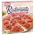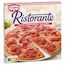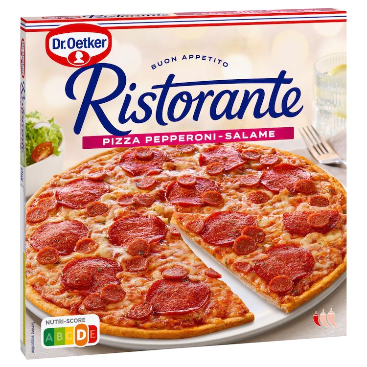 Pizza à pâte fine et croustillante richement garnie de tomates, de salami piquant et de fromage, surgelée.