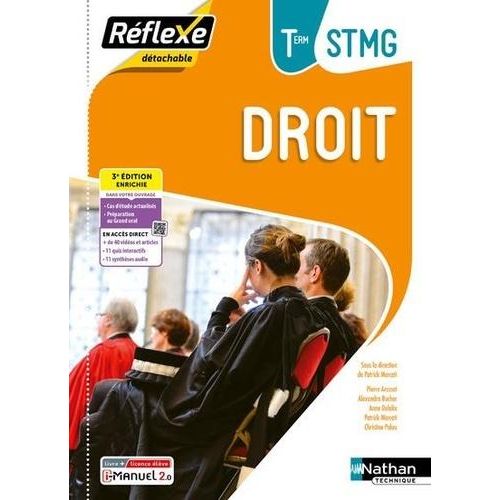 Cet ouvrage (Pochette Réflexe) de Droit Tle STMG a été enrichi et toutes les données ont été actualisées. Il est découpé en 4 thèmes en conformité avec le programme. Il répond parfaitement aux différentes pratiques d'enseignement et permet une grande liberté pédagogique. Il est proposé au choix en livre papier + licence numérique i-Manuel ou en 100% numérique i-Manuel. En version imprimée, cet ouvrage propose en complément une licence numérique i-Manuel 2. 0, la solution pour mettre les élèves en activité sur ordinateur ou sur tablette. En cas de prescription à l'ensemble de la alte (20 élèves minimum), l'activation de la licence élève est laissée au libre choix de l'enseignant. Cette édition 2024 propose : une actualisation qui tient compte de l'actualité et des évolutions du droit : réforme des retraites, mobilités douces, recours au télétravail... , l'ajout de synthèses audio , de quiz interactifs et d' un nouvel entraînement au Bac pour le thème 8 , l'identification des compétences Pix tout au long des chapitres. Structure d'un chapitre : - Une page d'ouverture présente une mise en situation tirée d'un cas réel et propose la rubrique Avant la alte pour découvrir le thème du chapitre à partir d'une vidéo. - Cette mise en situation, filée tout au long du chapitre , permet de découvrir les notions à partir d'un exemple ou d'un contexte réel, connu des élèves . - Une rubrique Allez plus loin propose d'explorer 'application des notions à d'autres contextes ou de les approfondir et favorise la pédagogie différenciée. Des exercices de préparation au Grand oral sont également proposés. - Des Applications , dont un quiz interactif , permettent de travailler le vocabulaire, de vérifi r les connaissances, retravailler les notions dans des contextes différents et mettre en oeuvre les méthodologies. - Une synthèse schématique , une synthèse audio et une synthèse à rédiger à partir des mots clés récapitulent les notions. - Une application Se préparer au Bac à la fin du chapitre et un entraînement à la fin de chaque thème permettent de travailler la méthodologie. En + dans l'ouvrage : Des fiches méthode Un sujet type examen.