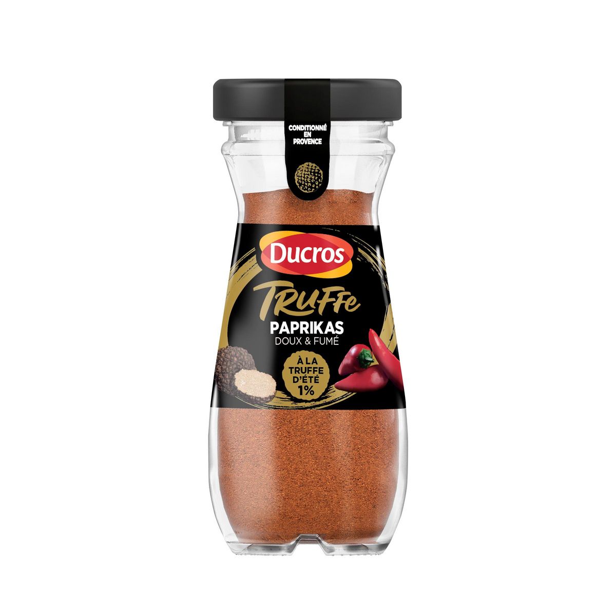 Ingrédients : épices (paprika doux (78%), paprika fumé (19%)), truffe d'été (tuber aestivum vitt.) lyophilisée (1,05%), arôme naturel, huile de tournesol.