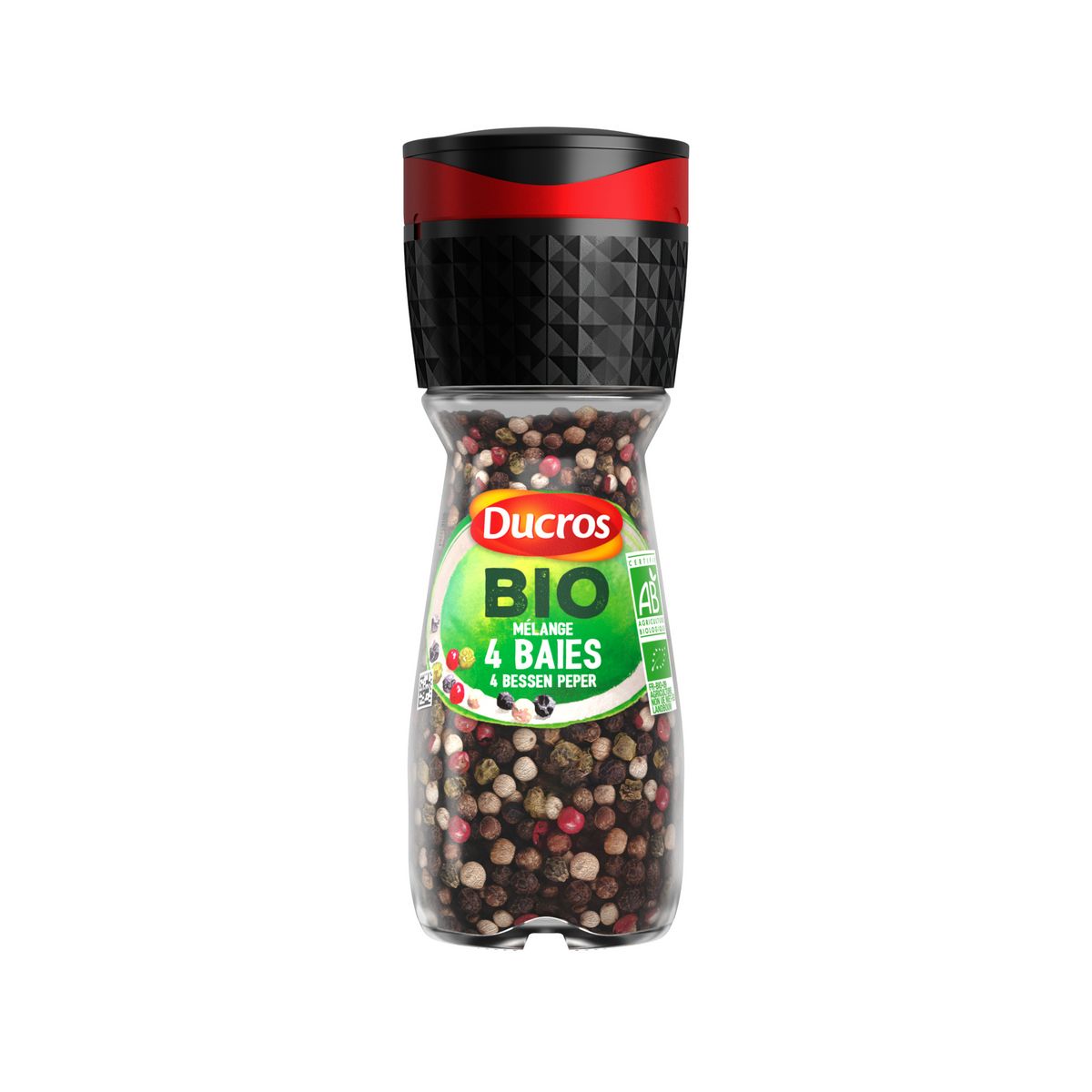 Ingrédients: poivre noir* (55%), poivre blanc* (35%), poivre vert* (5%), baie rose* (5%). *ingrédients issus de l'agriculture biologique.