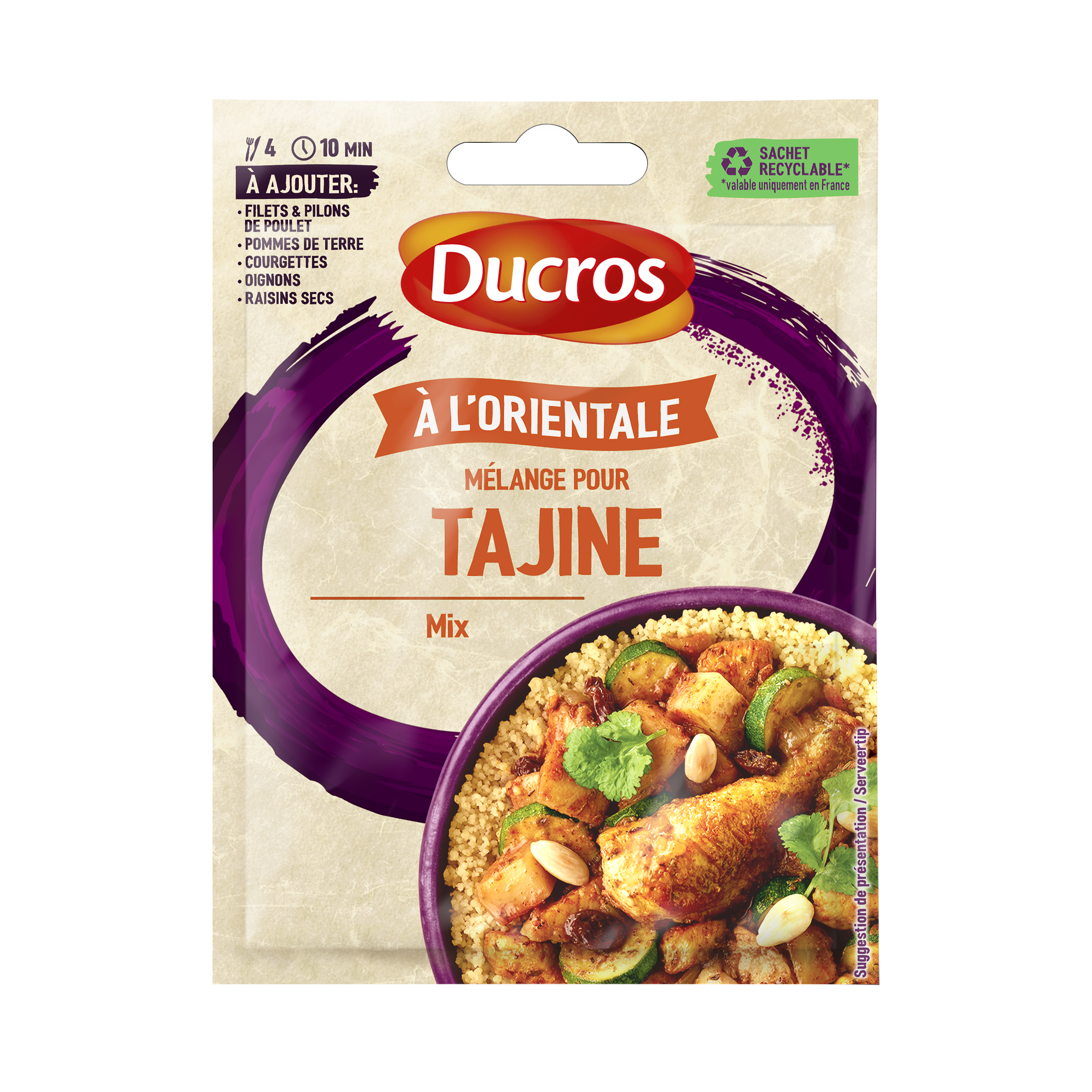 SACHET RECYCLABLE* *valable uniquement en France SANS CONSERVATEUR AJOUTÉ SANS COLORANT SANS ARÔME ARTIFICIEL SANS SEL AJOUTÉ À AJOUTER:• FILETS & PILONS DE POULET• POMMES DE TERRE, COURGETTES• OIGNONS, RAISINS SECS