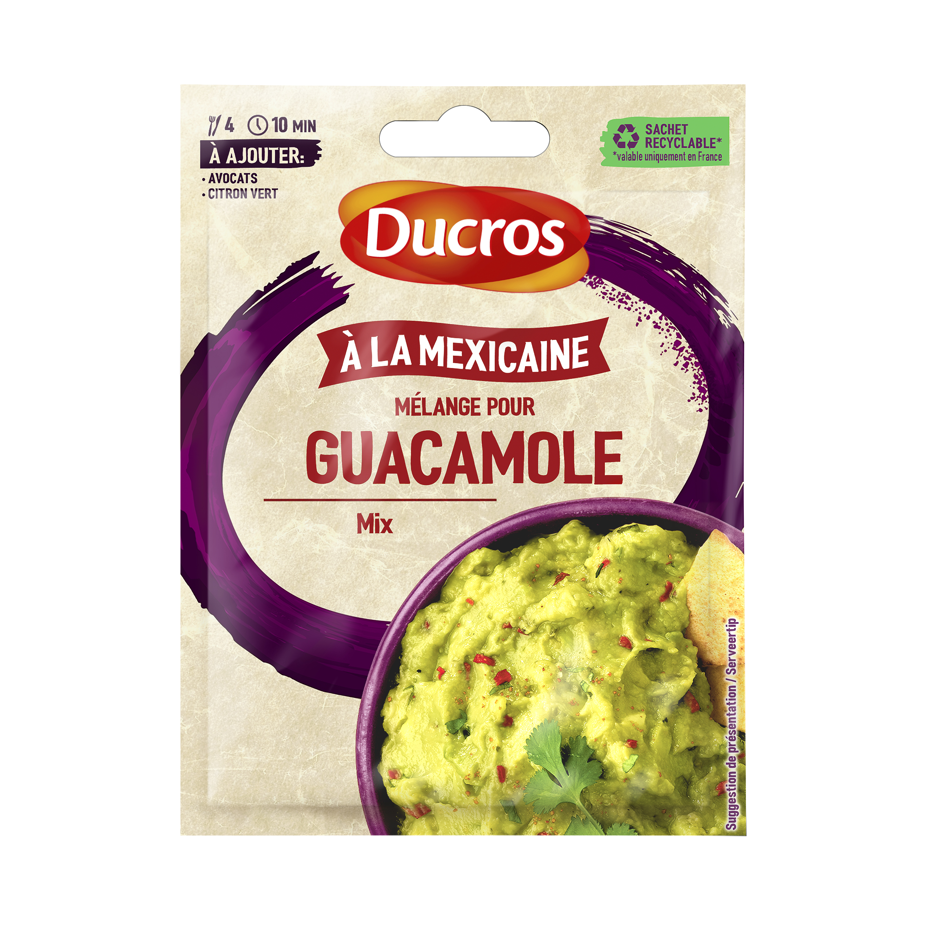 Servez en apéritif, avec des chips de maïs ou tortillas grillées ou en accompagnement de tacos, fajitas... 4 / 10 min. / 30 min. VOUS AVEZ BESOIN DE : • 2 avocats bien mûrs (300g de chair) • 1 citron vert 3 ÉTAPES FACILES :1. Ecrasez la chair des avocats à la fourchette dans un saladier, jusqu'à obtenir une purée.2. Incorporez le contenu du sachet à la purée d'avocat, ainsi que le jus d'un citron vert, salez à votre convenance.3. Couvrez et placez au froid 30 min.