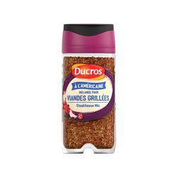 Ingrédients: epices (poivre noir (24%), oignon déshydraté, graine de MOUTARDE jaune, graine de coriandre, piment (7,4%), ail déshydraté (2%), gingembre, cumin), sel de mer (11%), poivron rouge, herbes (laurier, origan), huile d'olive vierge extra.