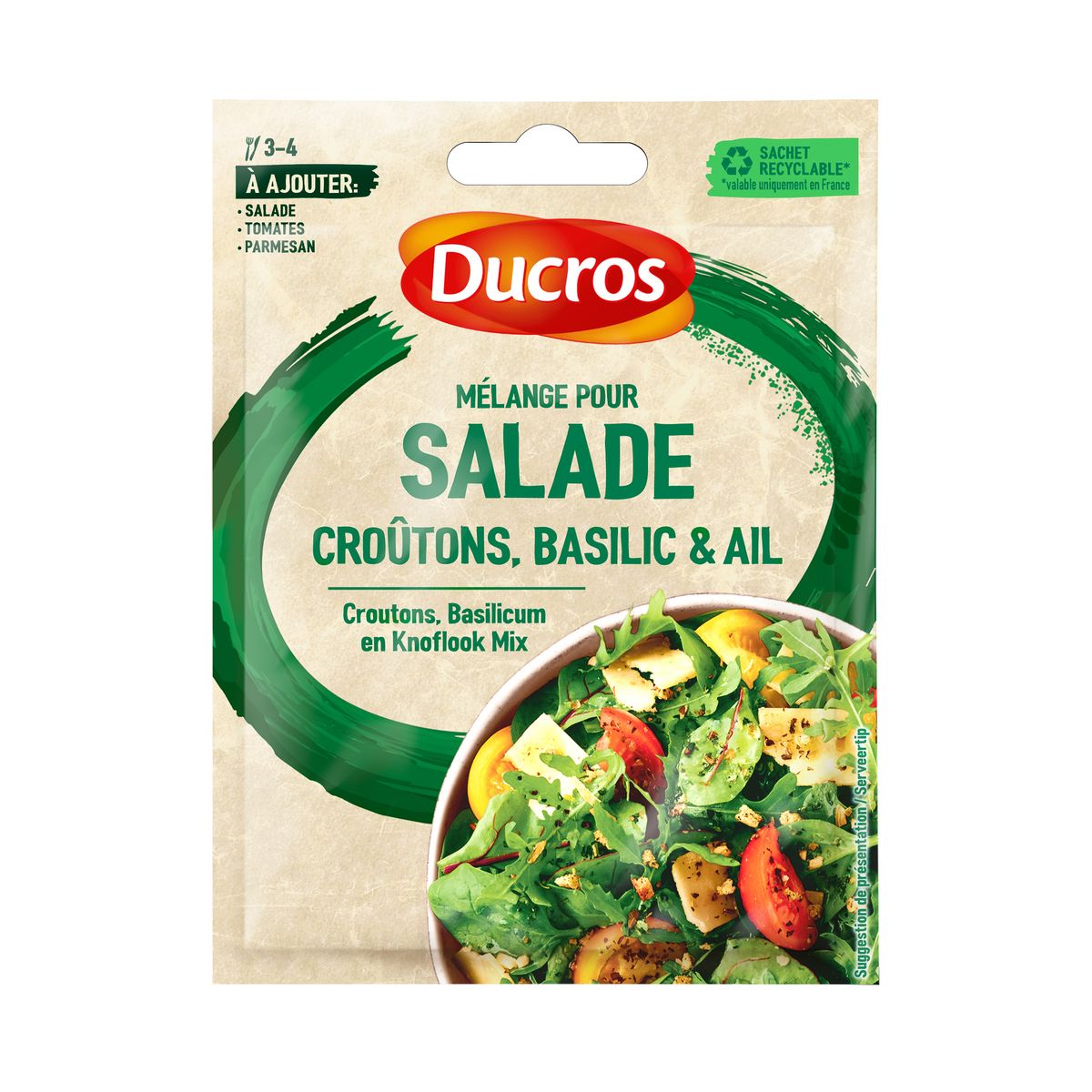 Ingrédients : croûtons de pain (farine de BLE, huile de tournesol, sel, levure, antioxydant : extraits de romarin, vitamines et minéraux : vitamine b1, niacine, carbonate de calcium, fer) (60%), herbes (basilic (20%), origan, persil), épices (oignon déshydraté, ail déshydraté (4%)). peut contenir moutarde, oeuf, lait, céleri, graine de sésame et soja.