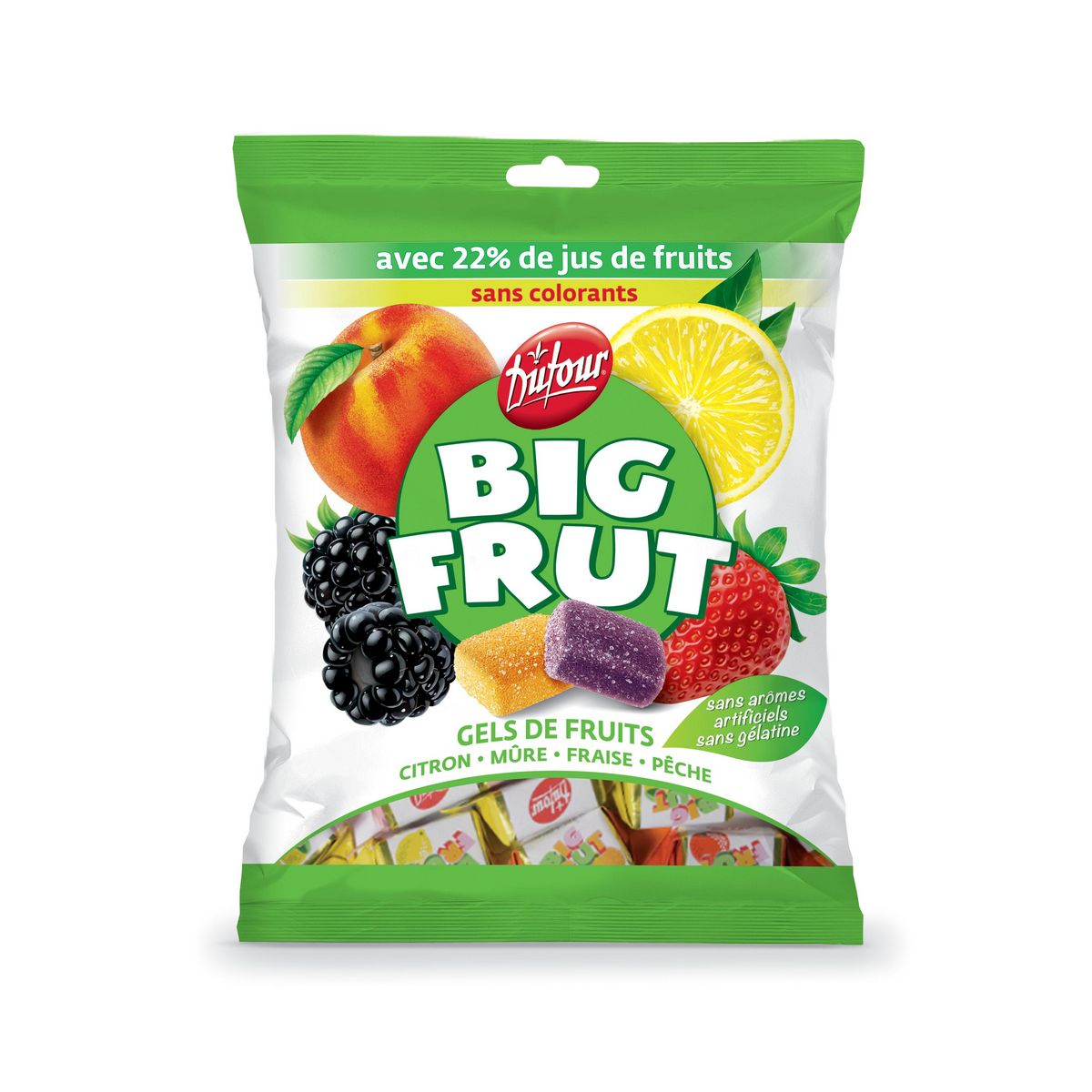 Avec 22% de jus de fruit, dans une recette sans colorants, sans arômes artificiels et sans gélatine animale, les Big Frut Dufour sont riches en saveurs, tendres et au goût intense.
