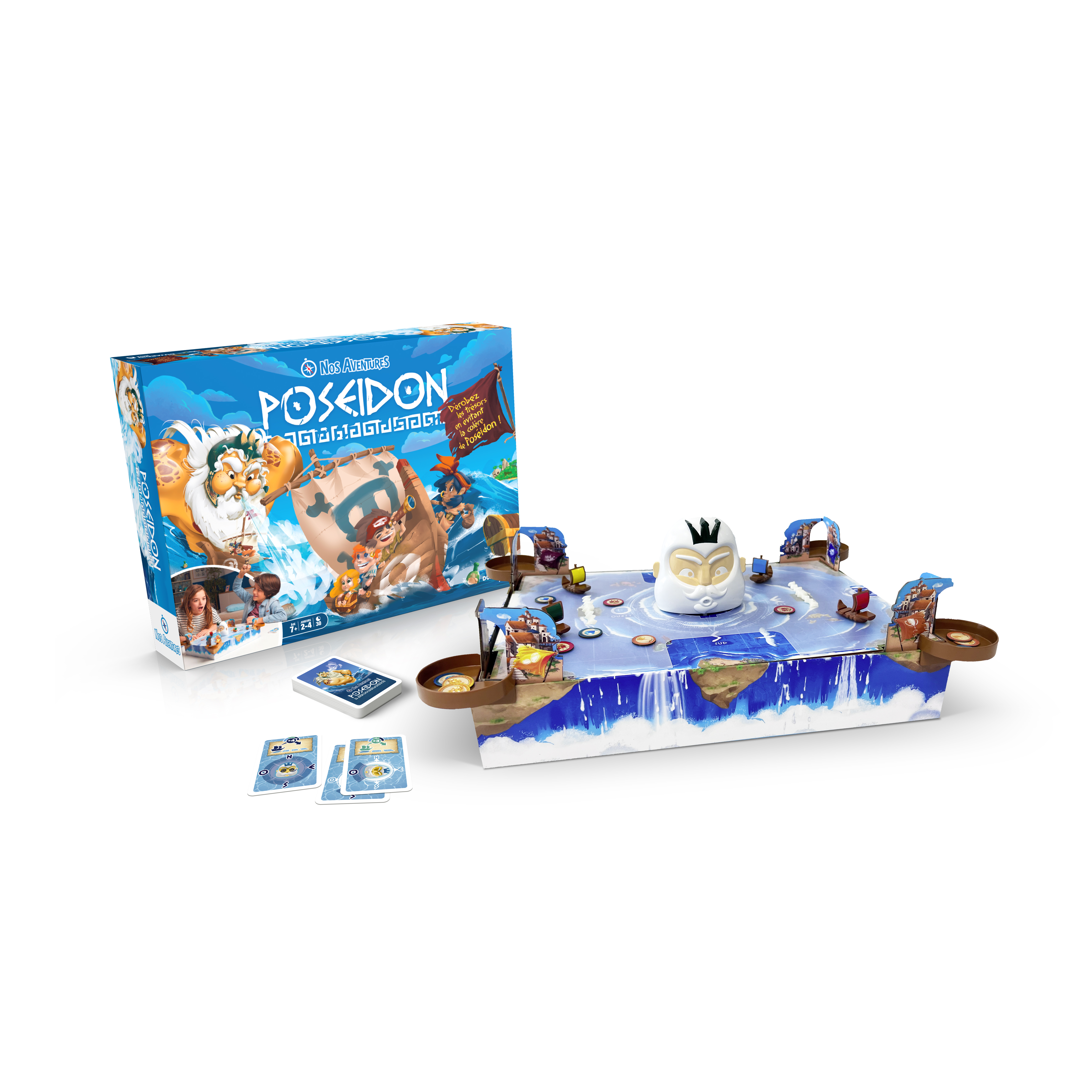"Dans une tempête déchainée, 4 bateaux pirates traversent les mers pour ramener 4 trésors à leurs ports. Attention, ils devront prendre garde aux courants, tourbillons mais surtout à la colère du tout puissant du Dieu des mers : Poséidon.Il sera possible de récupérer les trésors échoués ou encore de faire du commerce avec les autres joueurs pour récupérer tous les trésors. Pour remporter la partie, il faudra ramener en premier à son port, le butin composé des 4 trésors uniques de Poséidon."
