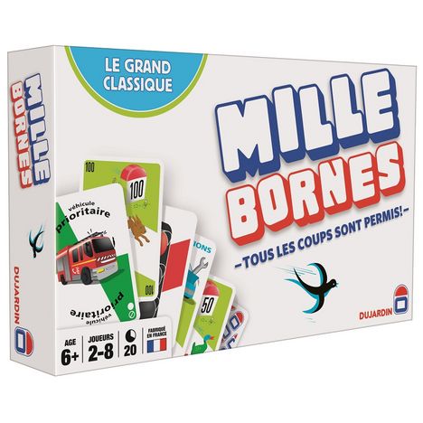 Mille Bornes, un grand classique signé Dujardin ! La première équipe qui franchit 1000 km/1000 Bornes en évitant intelligemment les embûches de ses adversaires, gagne la partie !