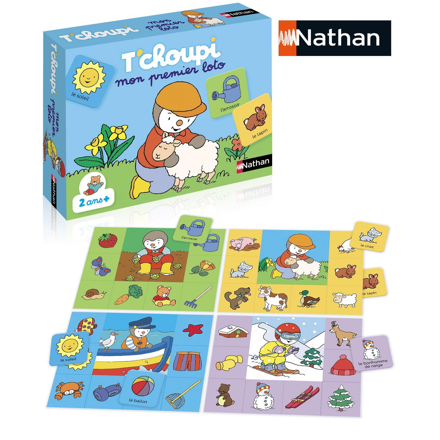 Un loto pour découvrir l’univers de T’choupi : à la mer, à la montagne, à la ferme et au jardin. Chaque planche correspond à un lieu et le but est de trouver les objets associés. Le premier enfant ayant complété sa planche a gagné.