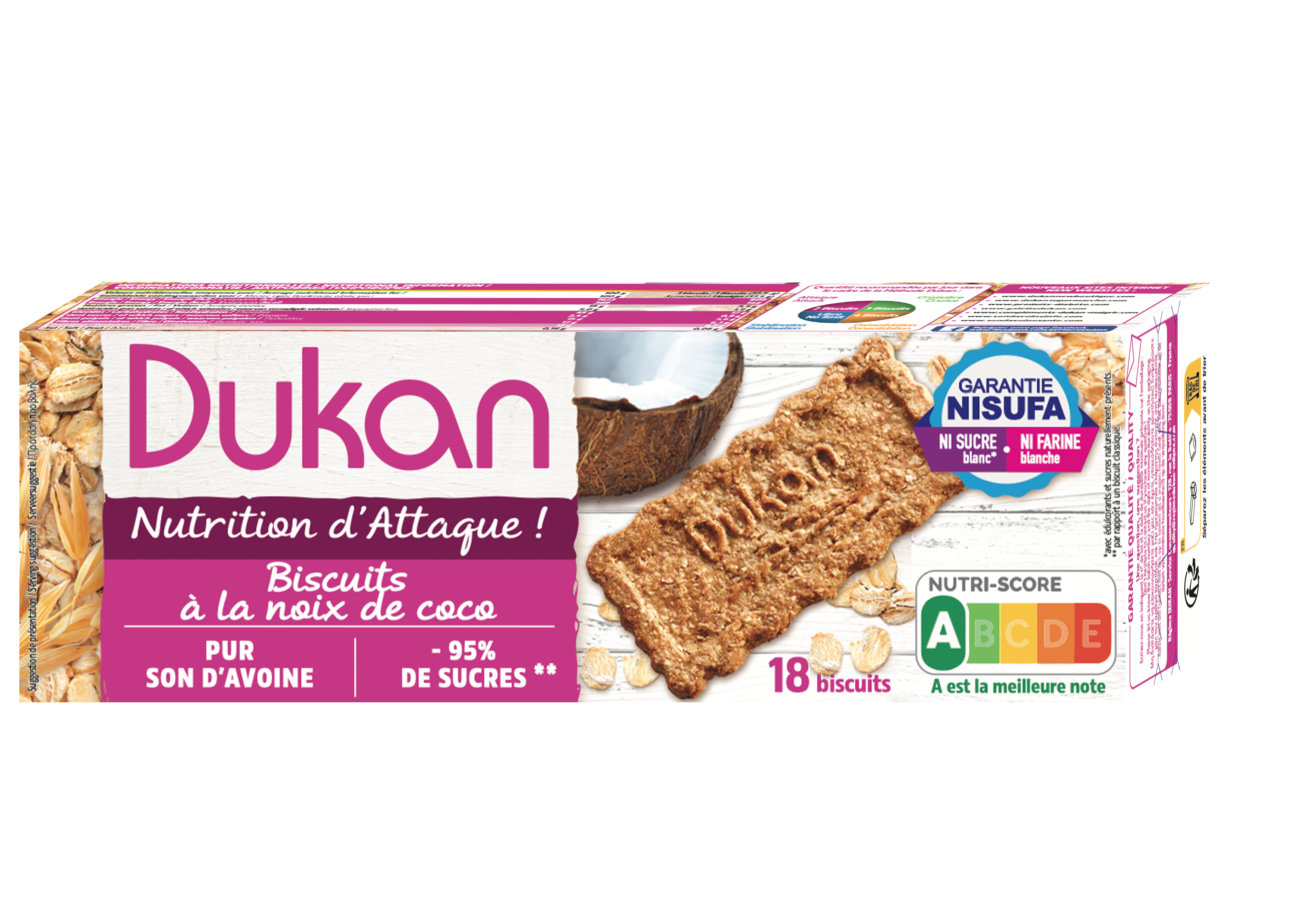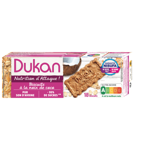 Ces biscuits Dukan sont garantis Nutriscore A, NISUFA (NI SUcres ajoutés* NI FArine blanche) et IG bas. Craquez pour le goût exotique de la noix de coco dans ce biscuit au pur son d'avoine ! Gourmand et rassasiant, vous en redemanderez !