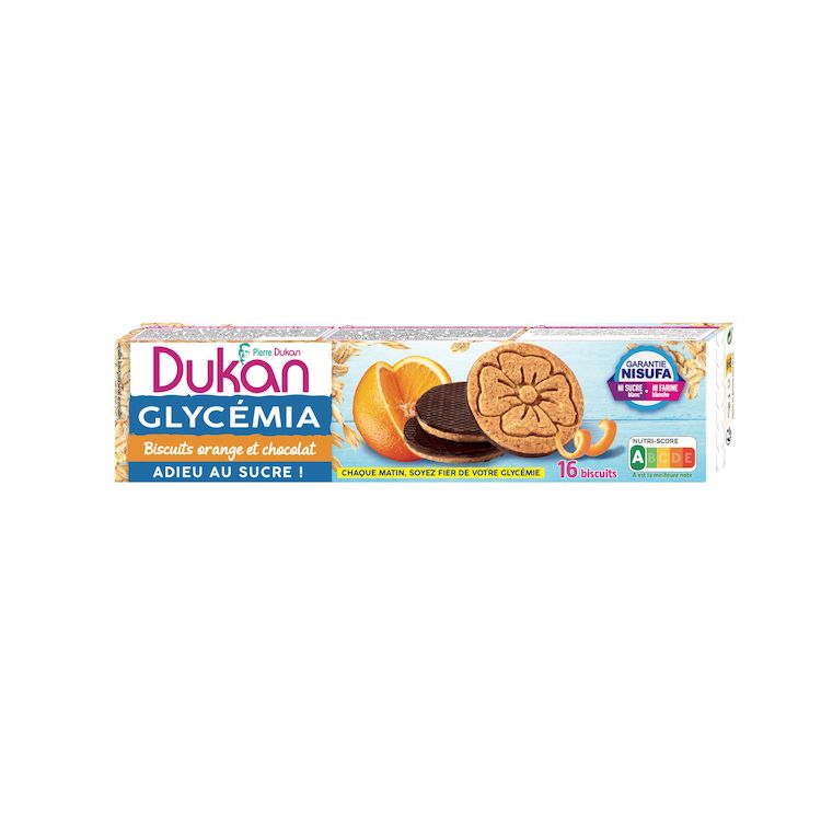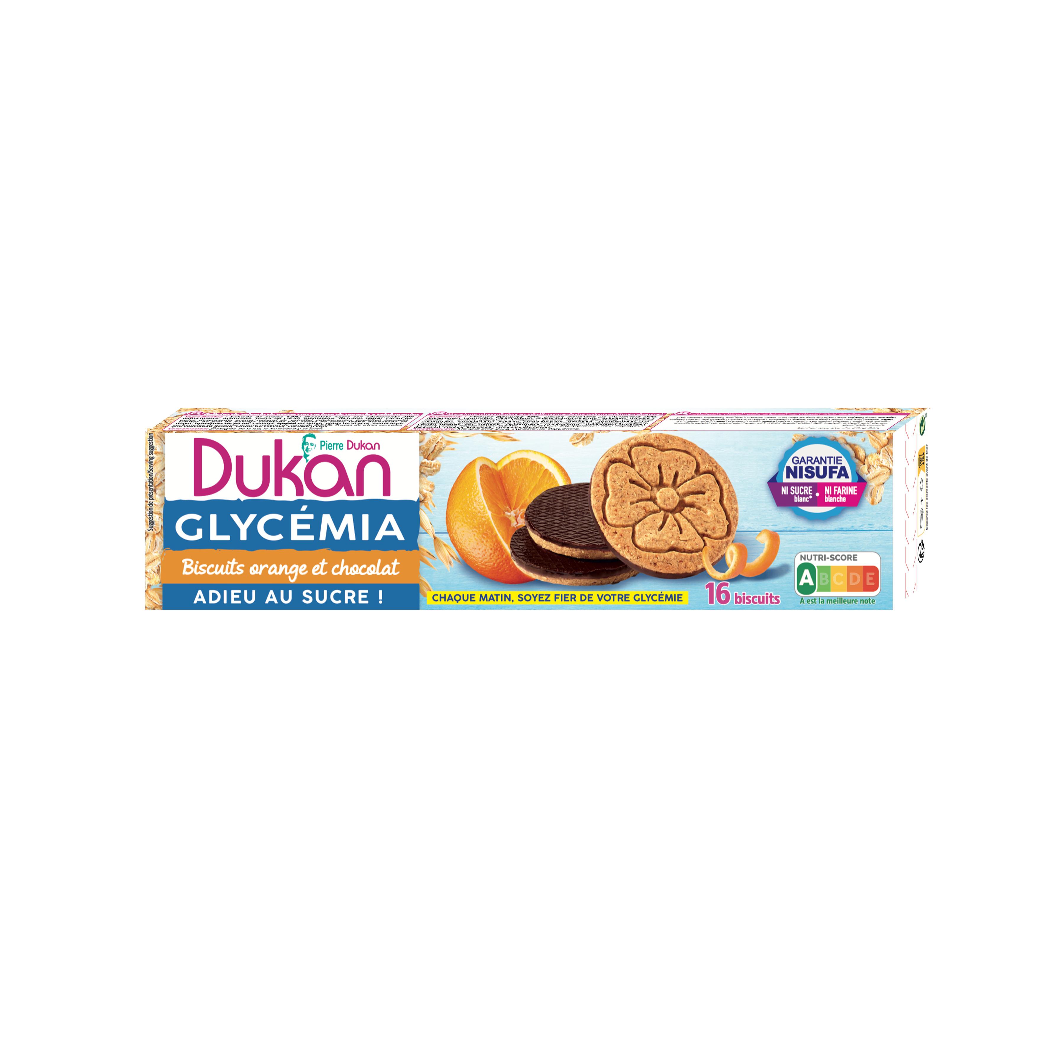 Ingrédients : Son d'avoine 43%, chocolat noir avec édulcorant 20% (édulcorant : maltitols, pâte de cacao, émulsifiant : lécithines (soja), poudre de cacao maigre, arôme naturel de vanille), édulcorants (maltitol, isomalt) ; cubes d’écorce d’orange soja confite 5% ; huile de colza ; lait écrémé en poudre, protéines de lait : caséine ; œuf en poudre ; fibres d'acacia ; poudre à lever : carbonates d’ammonium ; arôme naturel d’orange 0.54%