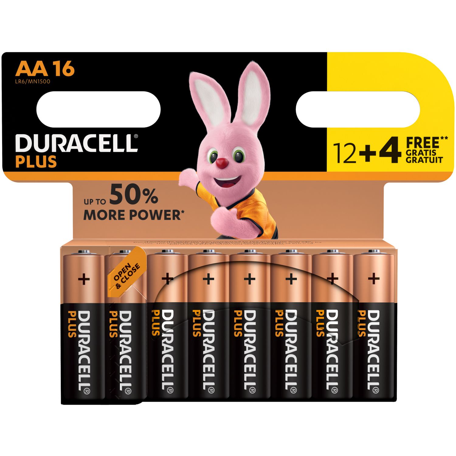 Duracell Plus, lot de 12+4 piles alcalines type AA 1,5 Volts, LR06 Tout le monde connait l'endurance du lapin Duracell ! Les piles Duracell Plus AA offrent une puissance fiable et longue durée pour alimenter tous vos appareils jusqu'à 50% plus longtemps*. Disponibles aux formats AA, AAA, C, D, 4,5V et 9V, les piles Duracell Plus bénéficient du revêtement Superior Nylon qui évite les coulures et protège les appareils préférés de toute votre famille tels que les lampes torches, les télécommandes, les pendules, les jouets, les consoles de jeux, et plus encore... La technologie Duralock permet de conserver toute l’énergie de vos piles Duracell jusqu'à 10 ans dans leur emballage**. Depuis plus de 50 ans, la marque Duracell et son célèbre lapin proposent une large gamme de piles hautes performances. Duracell fut même la première pile à être allée sur la lune en participant à la mission Apollo 11 en 1969 (*performance de longévité comparée à la Durée Moyenne Minimum du test standard IEC 2015 pour les piles de format AA sur les Appareils Photos Numériques. Les résultats peuvent varier suivant l’appareil et l’utilisation - www.iec.ch / ** dans des conditions normales de stockage).