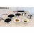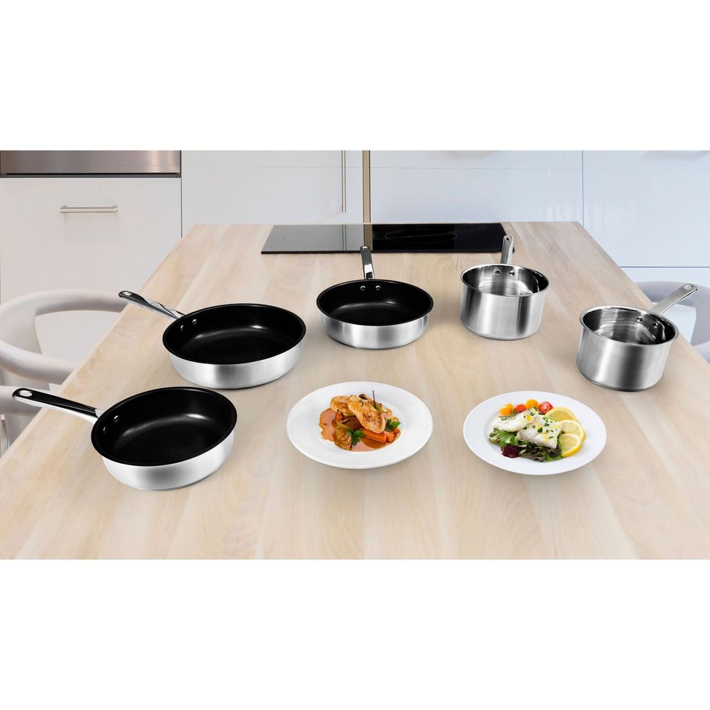 Composition du set : 3 Poêles : Ø 22 cm, hauteur : 6,7 cm, contenance : 2,2 L Ø 24 cm, hauteur : 6,8 cm, contenance : 2,6 L Ø 26cm, hauteur : 6,8 cm, contenance : 3 L 2 Casseroles : Ø 16 cm, hauteur : 10.5 cm, contenance : 1,9 L Ø18 cm ,hauteur : 11.1 cm, contenance : 2,6 L Matériau: acier inoxydable