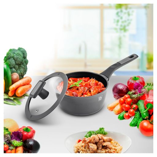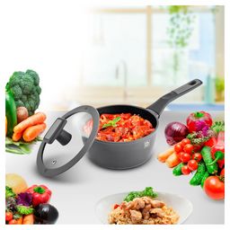 Casserole en aluminium forgé, un matériau résistant aux chocs, à l'usure et aux températures élevées qui offre une répartition très homogène de la chaleur. Compatible tous feux dont induction. Revêtement anti-adhérent pour un nettoyage facilité. Poignée en bakélite agréable au toucher. Casserole diamètre 16 cm, livrée avec un couvercle en verre à bord silicone pour un maintien optimal de la chaleur. Casserole et couvercle diamètre 16 cm.