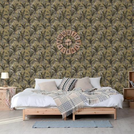 Ce papier peint durable presente un design intense avec un motif de palmiers dans des couleurs dore et noir. Il peut meme etre retire a sec sans endommager votre mur.