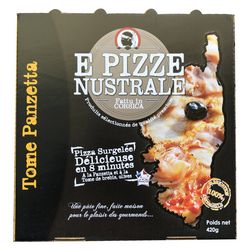 sauce tomate, tome de brebis, panzetta, emmental, olives, farine, eau, sel, levure, herbes du maquis.