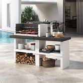 Barbecue sans hotte ligne design, livré en kit de montage. Structure réalisée en mélange de béton et matériau réfractaire, les plans de travail sont en Marmotech (un mélange de granulats de marbre très résistant) et sont teintés dans la masse anthracite. Equipé d’une grande grille de cuisson 76 x 40 cm réglable sur 2 niveaux + 1 grille chauffe-plats. Seuls les piètements et le foyer sont à protéger en appliquant une couche de 3-4 mm de crépi au quartz imperméable pour l’extérieur (non compris) et le plan de travail est à imperméabiliser en appliquant une couche de liquide hydrofuge transparent (non compris).