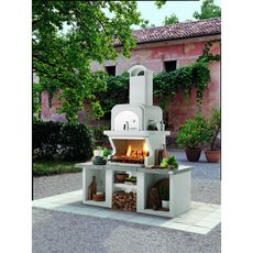 Grand combiné barbecue et four design, livré en kit d’assemblage – réalisé en mélange de matériaux réfractaires et de béton. Grand plan de travail en Marmotech poli. Four en acier inox à cuisson indirecte (il chauffe grâce aux fumées et au feu du gril en-dessous). Equipé de grande grille de cuisson, porte-bûches, hotte de protection en métal, matelas de protection pour plan de travail. Four en acier inox dim. 45x45 cm avec plan de cuisson en réfractaire, équipé de porte inox avec thermomètre. Livré avec kit de montage et de finition.