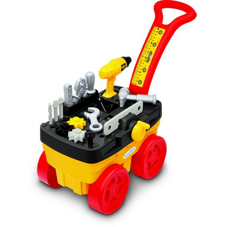 Ce chariot est tres complet et pratique pour transporter les outils dans toutes les pieces de la maison. Avec son couvercle qui sert de base de jeu, il contient de nombreux outils dont un étau fonctionnel. 19 pieces. Des 18 mois. Origine France Garantie