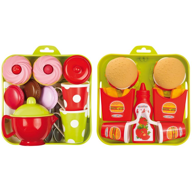 Un plateau avec 2 hamburgers, 2 portions de frites, 2 boissons et 1 bouteille de ketchup. Ou au choix, un petit plateau composé d'une théière, deux mugs, deux cuillières, deux cup cakes, un sucrier et 3 délicieux macarons. Origine France Garantie.