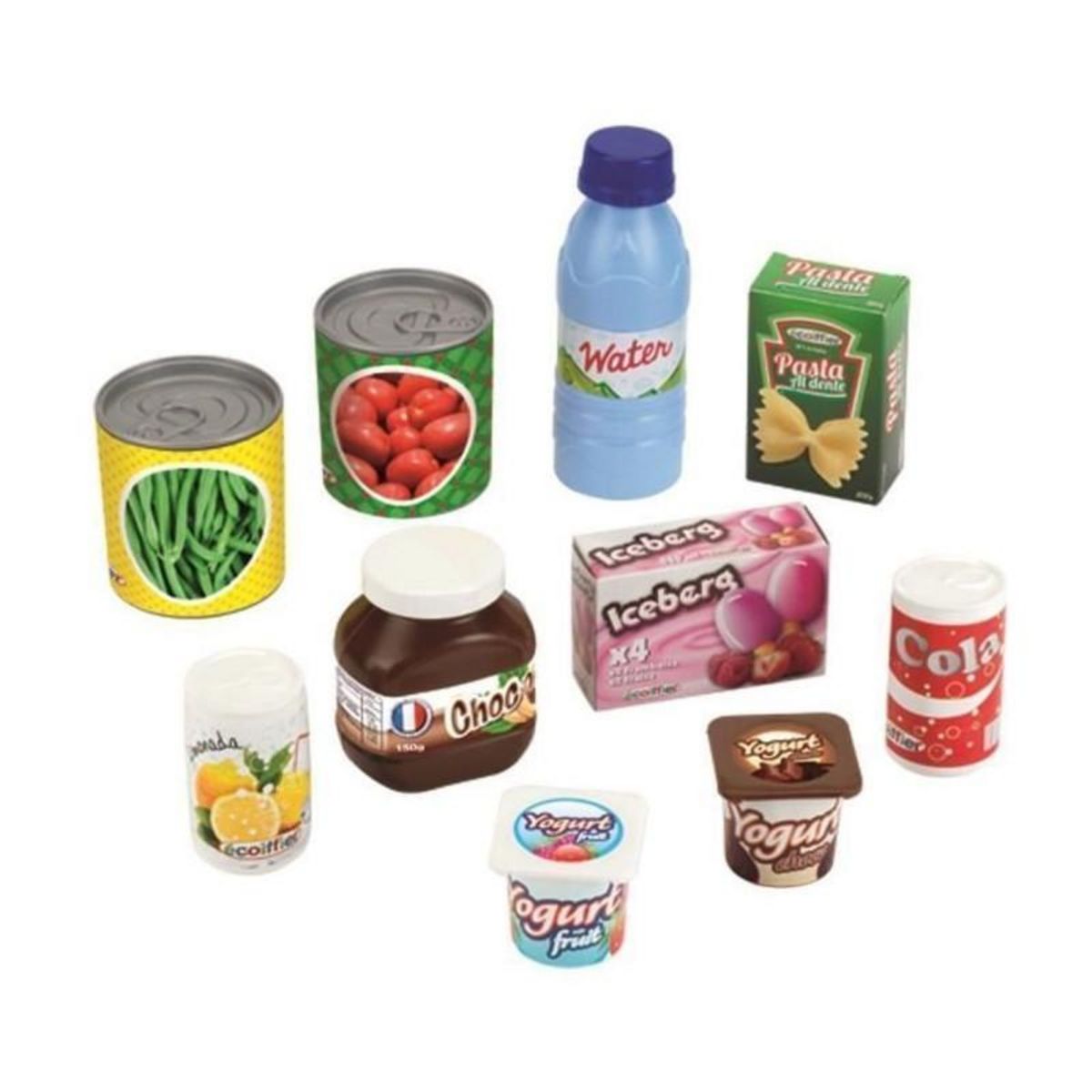 Ce filet contient les indispensables du placard a provisions avec 2 boites de conserve de tomates et de haricots verts, une boite de pâtes, un pot de pâte a tartiner, une boite d'esquimaux, 2 yaourts, une bouteille d'eau et 2 sodas. Recommandé des 18 mois. Fabrication française.
