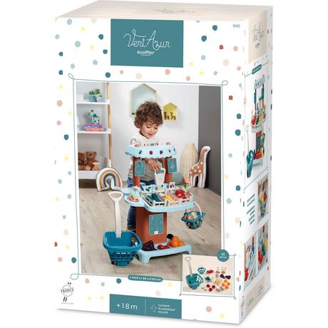 Une marchande roulante pour vendre des légumes frais en cagette ou des fleurs du jardin. Côté vendeuse, on retrouve une balance néo-rétro, un terminal carte bleue, des pièces de monnaie. Côté clients, un panier et un chariot sont à disposition.