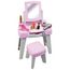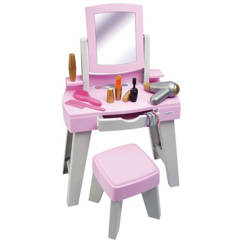 Cette jolie coiffeuse rose avec miroir et tabouret dispose d’un tiroir pour ranger le maquillage, brosse à cheveux, peigne, sèche cheveux et bracelets.