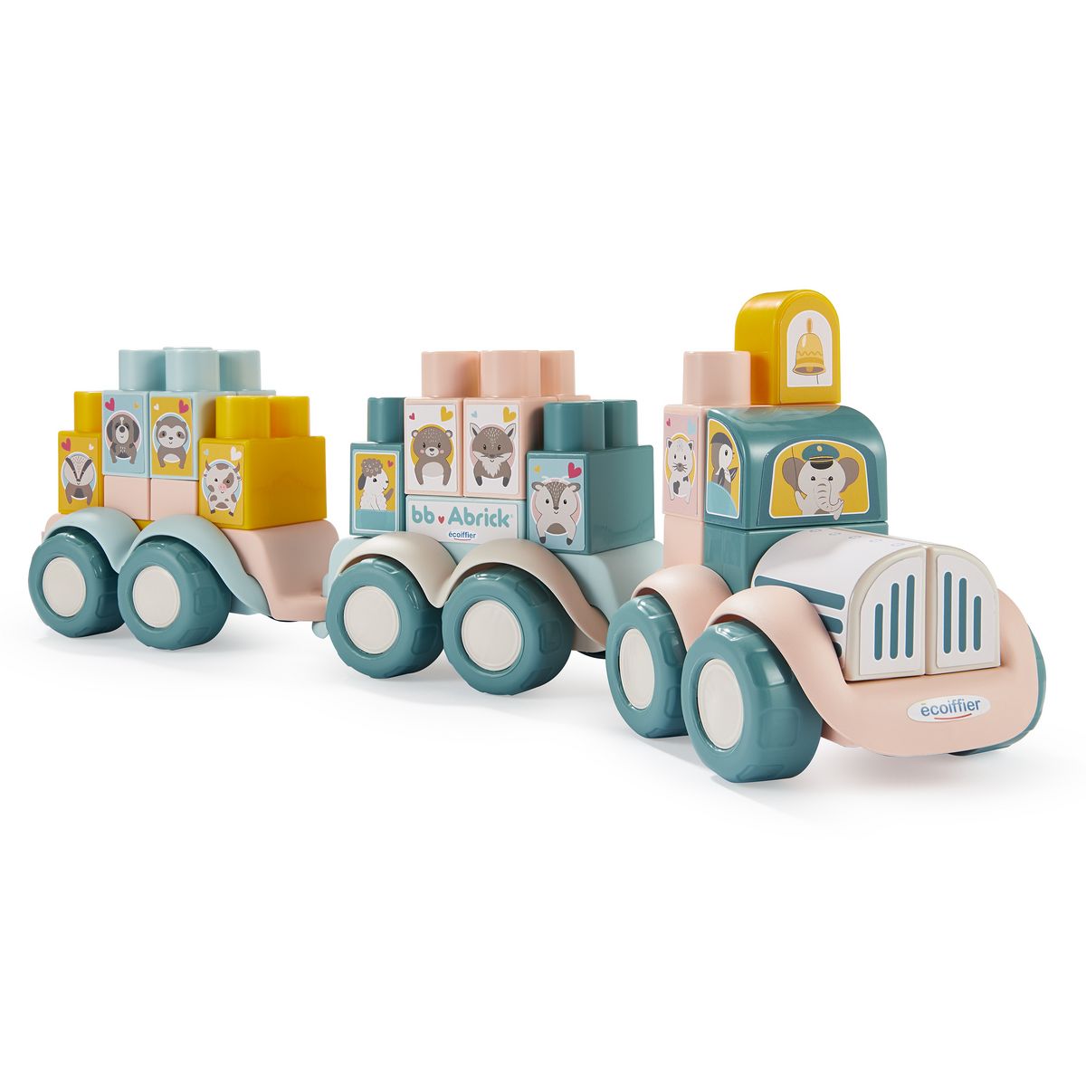 Ce train a construire aux couleurs pastels, accompagné de ses adorables voyageurs permettra a votre enfant de développer sa motricité et son imagination. Des 12 mois. Origine France Garantie.