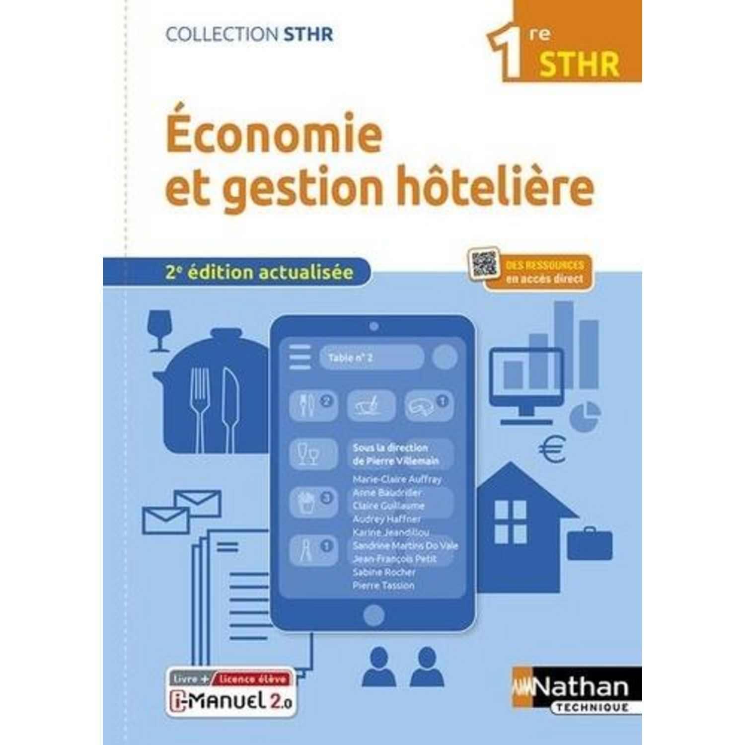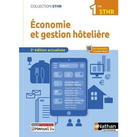 Cet ouvrage d'Economie et Gestion hôtelière Bac STHR couvre intégralement le programme de 1re. Il est proposé au choix en livre papier + licence numérique i-Manuel ou en 100% numérique i-Manuel. En version imprimée, cet ouvrage propose en complément une licence numérique i-Manuel 2. 0, la solution pour mettre les élèves en activité sur ordinateur ou sur tablette. En cas de prescription à l'ensemble de la alte (20 élèves minimum), l'activation de la licence élève est laissée au libre choix de l'enseignant. Cet ouvrage offre un contenu attractif et adapté au niveau des élèves, et les rend acteurs de l'acquisition des connaissances et des capacités du programme. Structure d'un chapitre - Une partie Découverte permet d'illustrer et de faire découvrir les différentes notions et différents concepts du chapitre. - Une partie Cours enrichie d'exercices de compréhension permet de fixer les connaissances attendues et de présenter les capacités à acquérir. - Une partie Applications permet aux élèves de mettre en oeuvre les notions étudiées et de les approfondir. L'enseignant dispose ainsi d'une série d'exercices ciblés. - Une partie Synthèse propose des schémas à compléter pour s'assurer de l'acquisition des connaissances. Cet ouvrage de 1re est également conforme au programme de alte de MAN en hôtellerie-restauration.