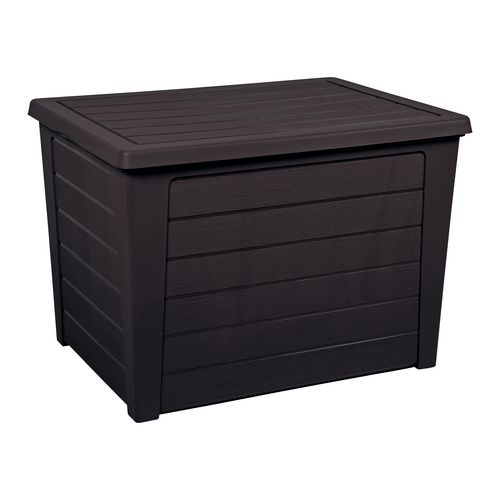 Cette malle de rangement pour extérieur, est en plastique. 2 coloris différents. Aspect bois. Equipée d'une sécurité anti-étouffement. Ce coffre BAYA est livré en kit.