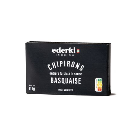 Chipirons* entiers (63%), tomates, huile d'olive, oignons, poivrons rouges, épices, sel.*Dosidicus gigas, péchés en Atlantique Sud-Ouest (FAO 41).
