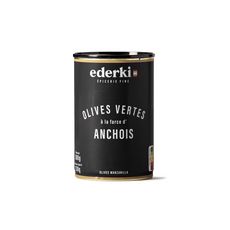 Ingrédients : Olives vertes ""Manzanilla"", sel, farce 6% (eau, anchois 30% (poissons), épaississant : alginate de sodium),