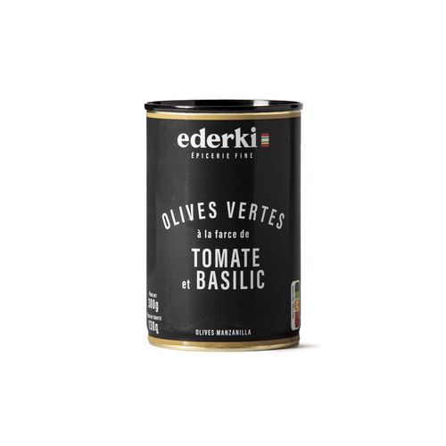 Ingrédients : Olives vertes "Manzanilla", sel, farce 6% (eau, tomate 17%, basilic 1,5%, épaississant : alginate de sodium), exhausteur de goût : E621, correcteurs d'acidité : acide citrique et acide lactique, antioxydant : acide ascorbique