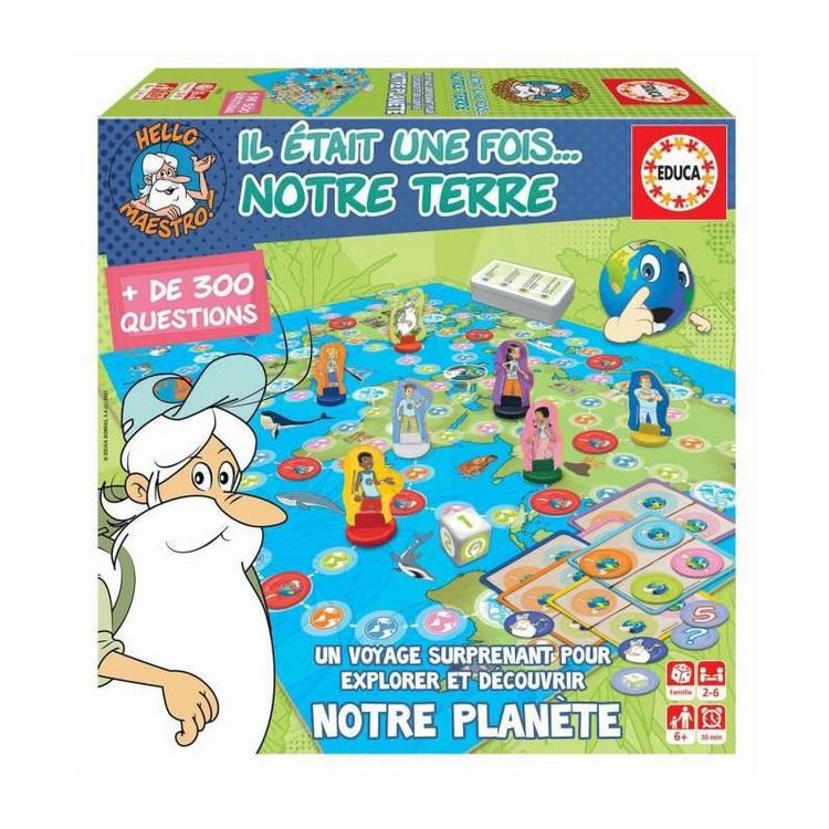 Un grand voyage autour de la Terre en compagnie de Maestro, qui vous envoie explorer le monde. Contient : 1 plateau de jeu, 6 pions personnage, 6 cartons >, 1 pion Maestro, 1 dé a 6 faces avec autocollants, 24 jetons planete réversibles, 15 jetons aide de Maestro, 96 cartes de questions.