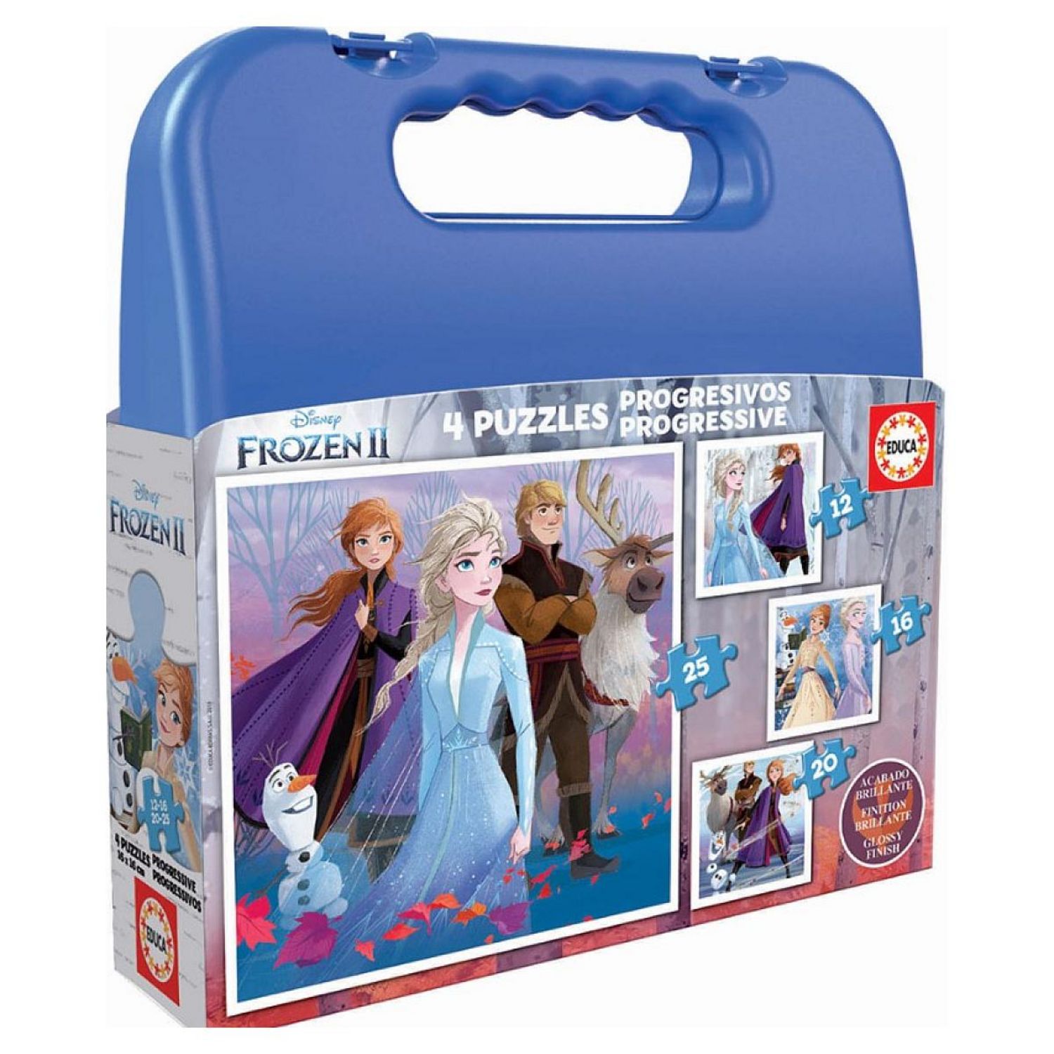 Une mallette qui contient 4 puzzles présentant différents niveaux de difficulté progressifs, aux couleurs d´Anna, Elsa et leurs amis de la Reine des Neiges 2 de Disney. Chaque mallette de puzzles progressifs contient 4 puzzles composés d'un nombre variable de pieces (de 12 a 25 pcs) pour que les enfants passent progressivement d'un niveau de difficulté au suivant au fur et a mesure qu'ils grandissent et gagnent en habileté. Rangez les puzzles facilement et emmenez-les ou vous voulez. Dimensions des puzzles assemblés : 16 x 16 cm